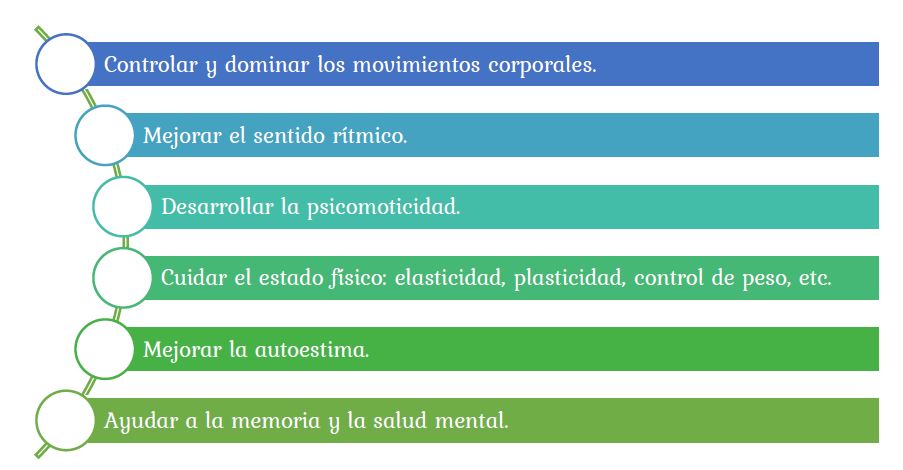 La Danza, a través de cualquiera de sus manifestaciones, es altamente beneficiosa a todas las edades. Su práctica desde los más pequeños fomenta en ellos valores como disciplina, compromiso y mejora las relaciones sociales. Además conlleva grandes beneficios tanto corporal como mentalmente, algunos de ellos son: